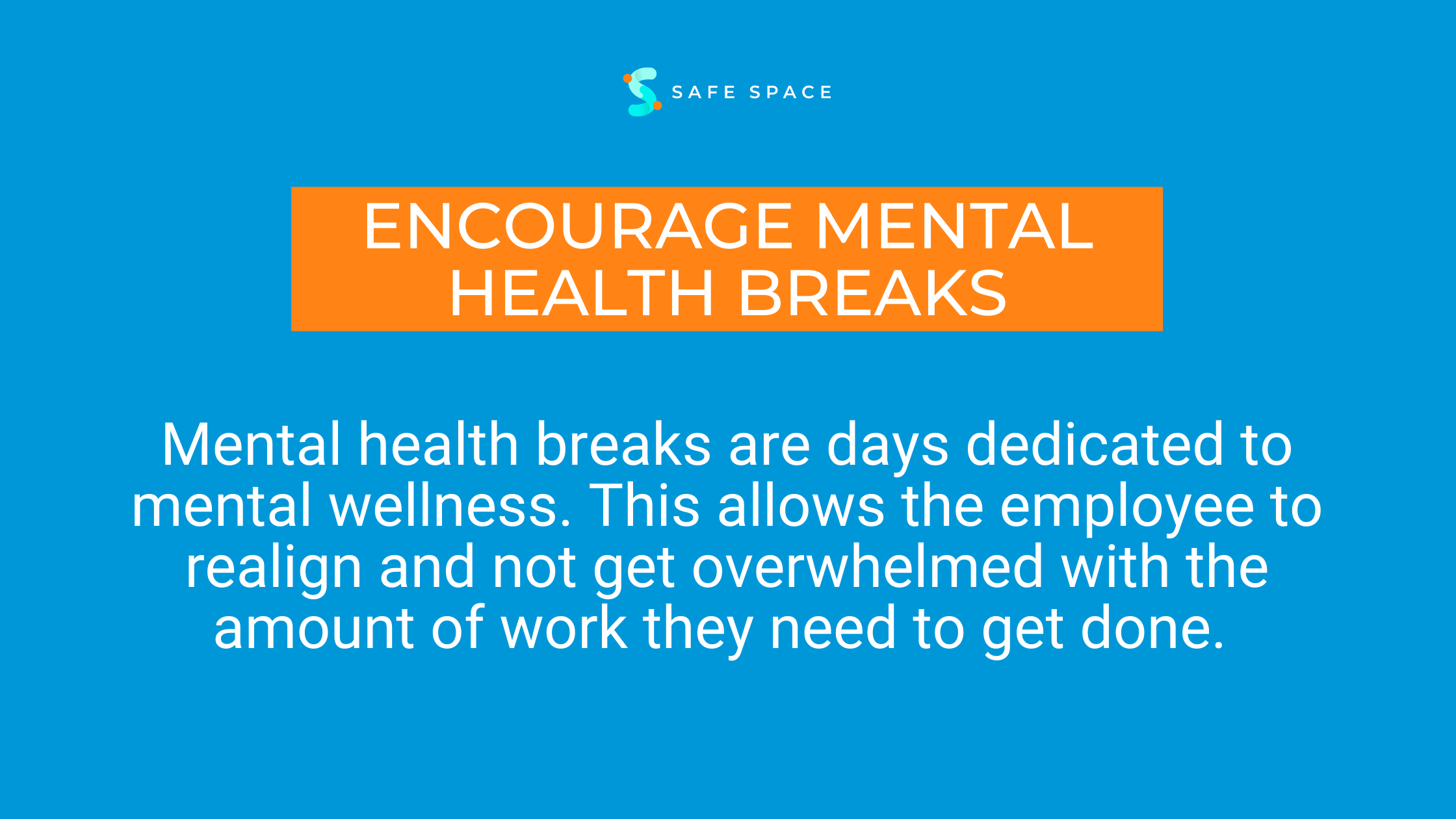 From a management standpoint, mental health breaks are days dedicated to mental wellness. Employees may use this to pamper themselves, make time for their interests, or do activities that help them relax. This allows the employee to realign and not get overwhelmed with the amount of work they need to get done.